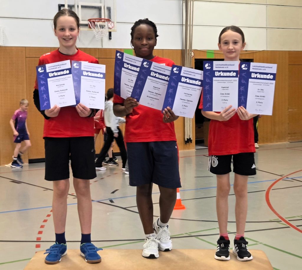 Erfolgreiches Trio bei den Hallenkreismeisterschaften in Schneverdingen. Emma, Neema und Jana (v.l.) haben hier die Farben des MTV vertreten. Alle drei konnten mit neuen Bestleistungen glänzen. Die Bilanz 1×1.; 3×2.; 3×3.