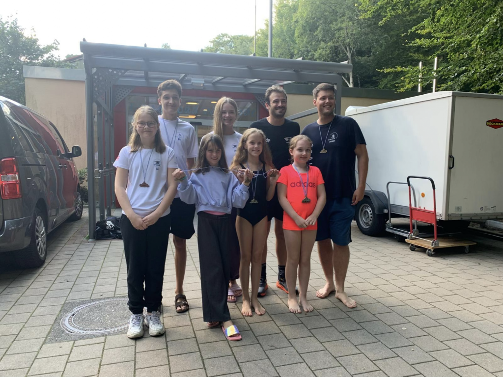 Am 30.08.2025 bekamen wir die Möglichkeit, uns als Mannschaft in Nienburg unter Beweis zu stellen und erschwommen den dritten Platz unter allen anwesenden Vereinen. Nach der Sommerpause bot sich Nienburg als hervorragender Wettkampf an um in die zweite Saison und Jahreshälfte zu starten. Angetreten sind Isabel W., Lea B., Liene S., Frida E., Emilie K. und Denis S. gemeinsam mit den älteren Leistungsschwimmern der Startgemeinschaft. Isabel W. und Denis S. starteten erstmals über 400m Freistil auf der Kurzbahn (25m Bahnenlänge) und erreichten 06:09,5 und 06:24,9. Isabel schwimmt somit nach erstem Start nur knapp an der Bezirkszeit ihrer Altersgruppe vorbei. Freudig startet Lea B. Ende des Monats auch in der Disziplin über 200m Freistil auf der Bezirksmeisterschaft. Denis S. schwamm erstmals unter 00:30,00 auf 50m Freistil. Auch der Nachwuchs zeigte sich tapfer und wettkampforientiert.